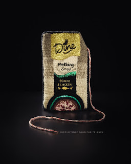 I was recently commissioned to create a series of crocheted cat food products for The Australian ad agency Clemenger BBDO via my illustration agent Agency Rush www.agencyrush.com for "Dine' cat food the Australian version of Sheba. Cat food made from yarn surely is surely any cat's idea of heaven!
